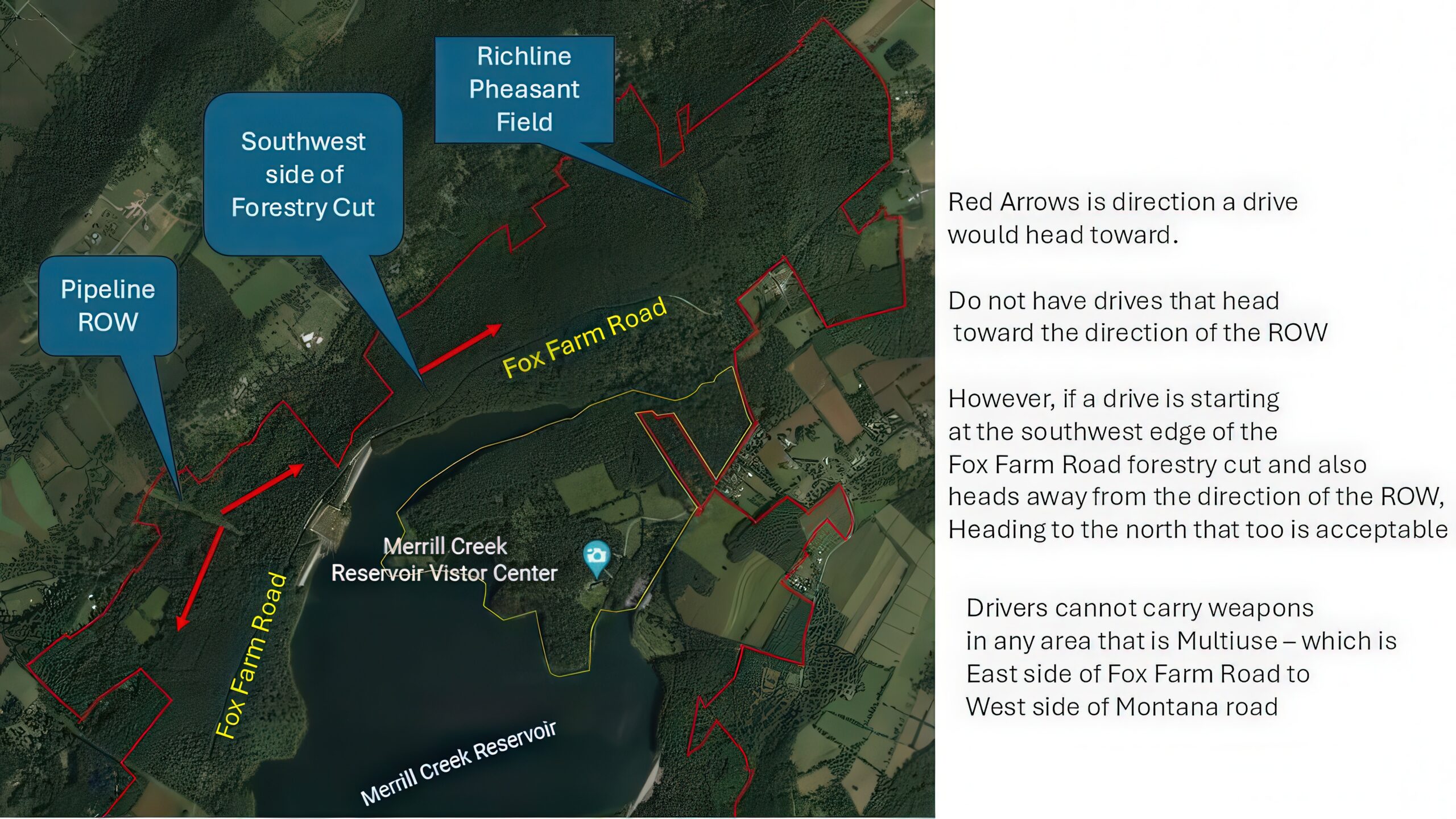 NOTE: Any drive that takes place on the west side of Fox Farm Road (that is the hunting only part of the property), that the drive MUST start at the ROW and head out away from the ROW. However, if a drive is starting at the southwest edge of the Fox Farm Road forestry cut it too must head away from the direction of the ROW, thus heading to the north is acceptable.