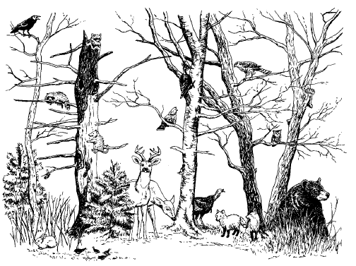 A component of a forest may be dead hollow logs or stand dead wood (snags) that are used as shelter for raccoons, owls, opossums, woodpeckers, and countless other wildlife. But dead or downed trees can also provide breeding areas for insects or provide nesting areas other animals. A large tree that has blown over in a windstorm typically has an uprooted root-ball. Exposed root-balls are used by many animals for shelter or even overwintering areas. Bears at Merrill Creek Reservoir have been known to borough under root balls and make a den for the winter, providing a safe place for female bears to hibernate and give birth
